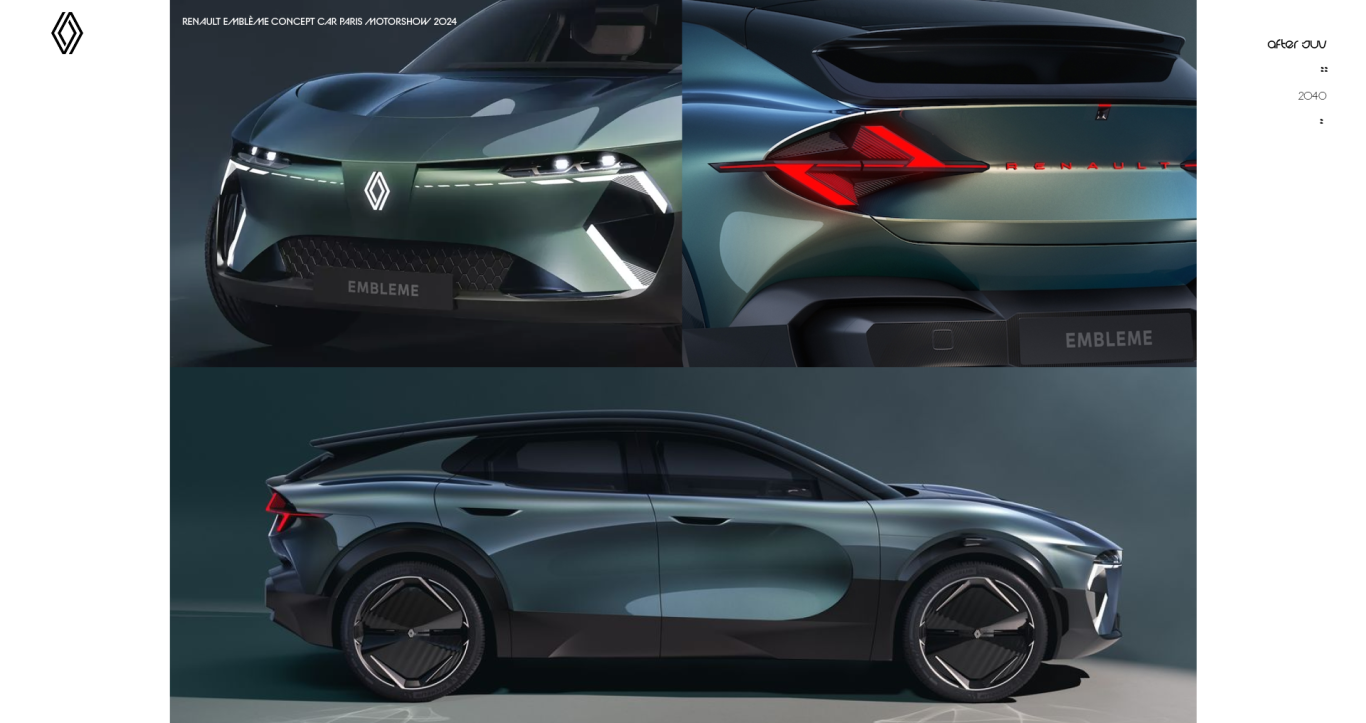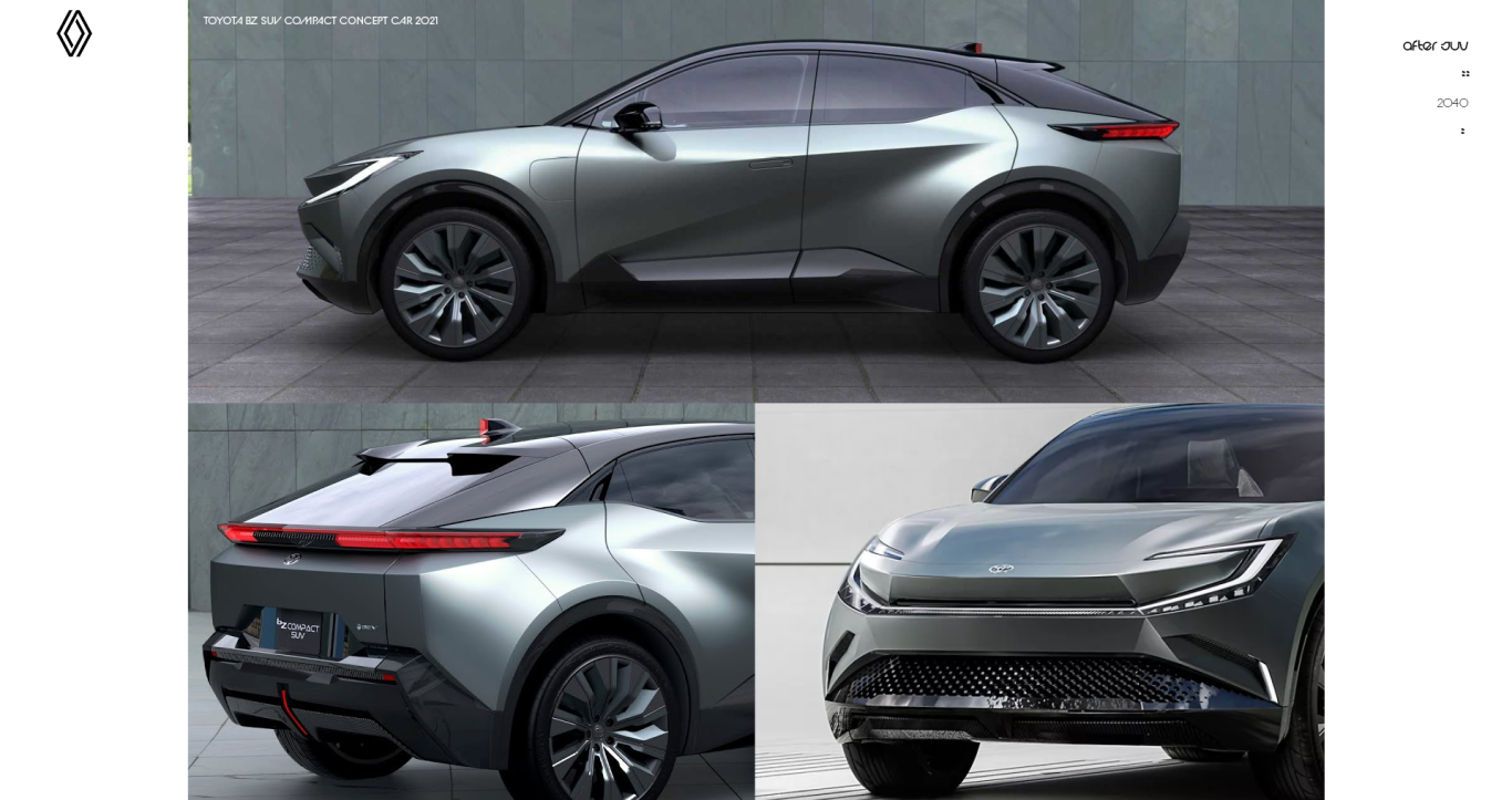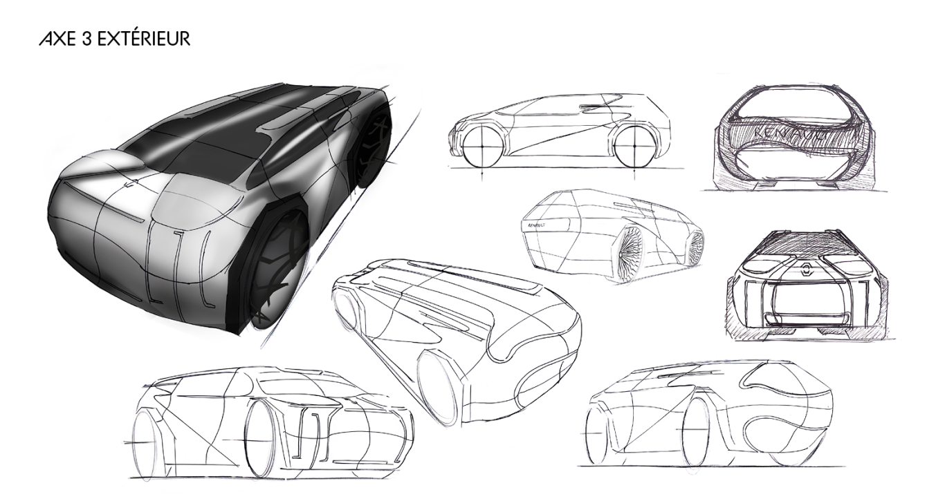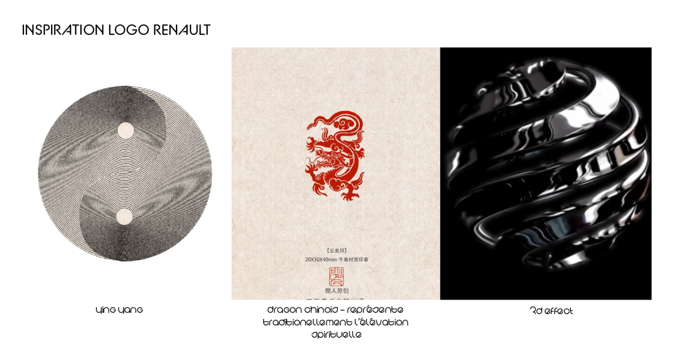 Pour mes inspirations, je me suis basée sur le style extérieur du concept car Emblème et de l'expérience utilisateur ainsi que de la couleur carrosserie du concept car Symbioz de Renault mais aussi d'un véhicule plus réalistique comme la Toyota BZ.