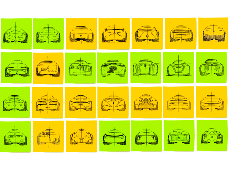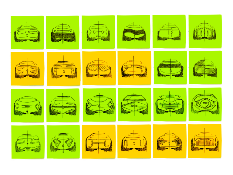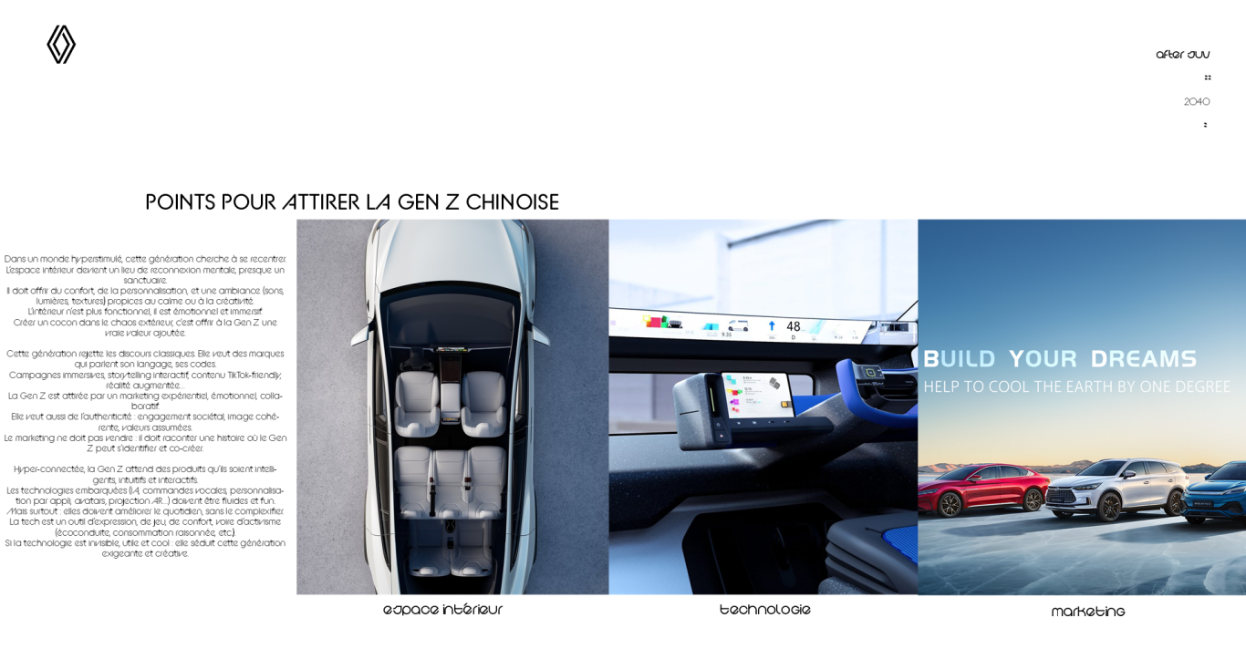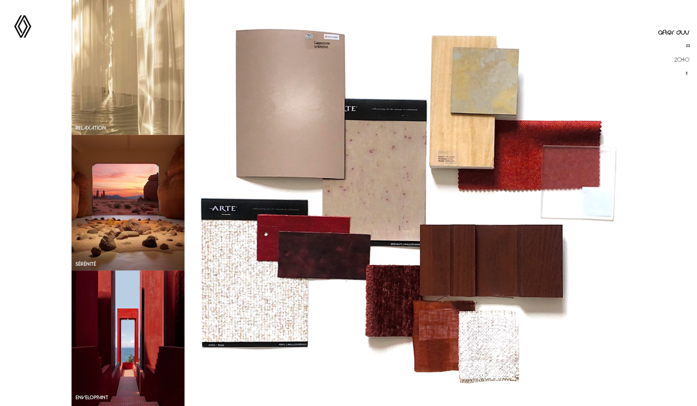Pour mes inspirations, je me suis basée sur le style extérieur du concept car Emblème et de l'expérience utilisateur ainsi que de la couleur carrosserie du concept car Symbioz de Renault mais aussi d'un véhicule plus réalistique comme la Toyota BZ.