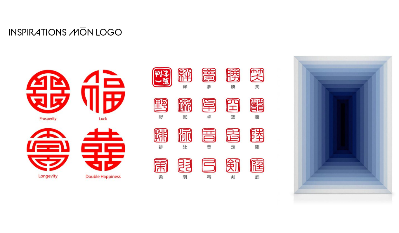 Pour garder cette esprit méditatif et traditionnel chinois, je me suis inspiré du symbole représentant le Ying et le Yang, du mouvement de la respiration, une représentation de notre porte intérieur et de symboles chinois.