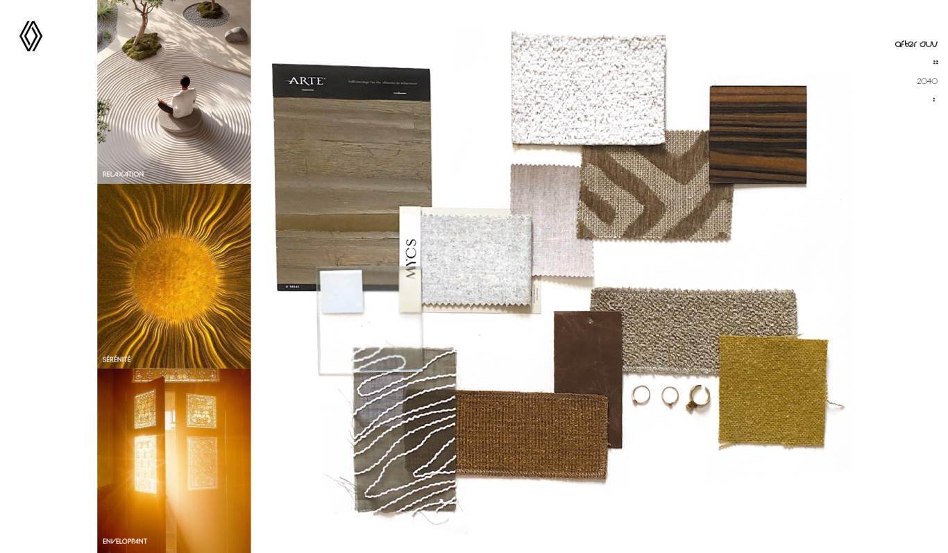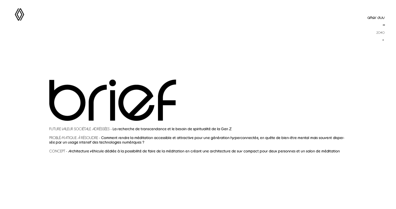 CONCEPT - Architecture véhicule dédiée à la possibilité de faire de la méditation en créant une architecture de suv compact pour deux personnes et un salon de méditation