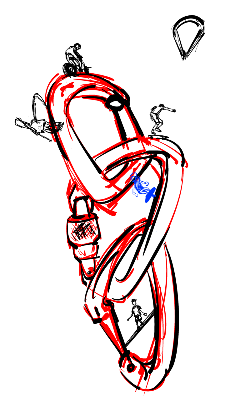 Par la suite, j'ai commencé à déformé et recréer la structure d'un BMX poursuiv par celle de tous les sports du festival en utilisant cette fois-ci les yeux en forme de bonhomme et le sourire en forme de bras.